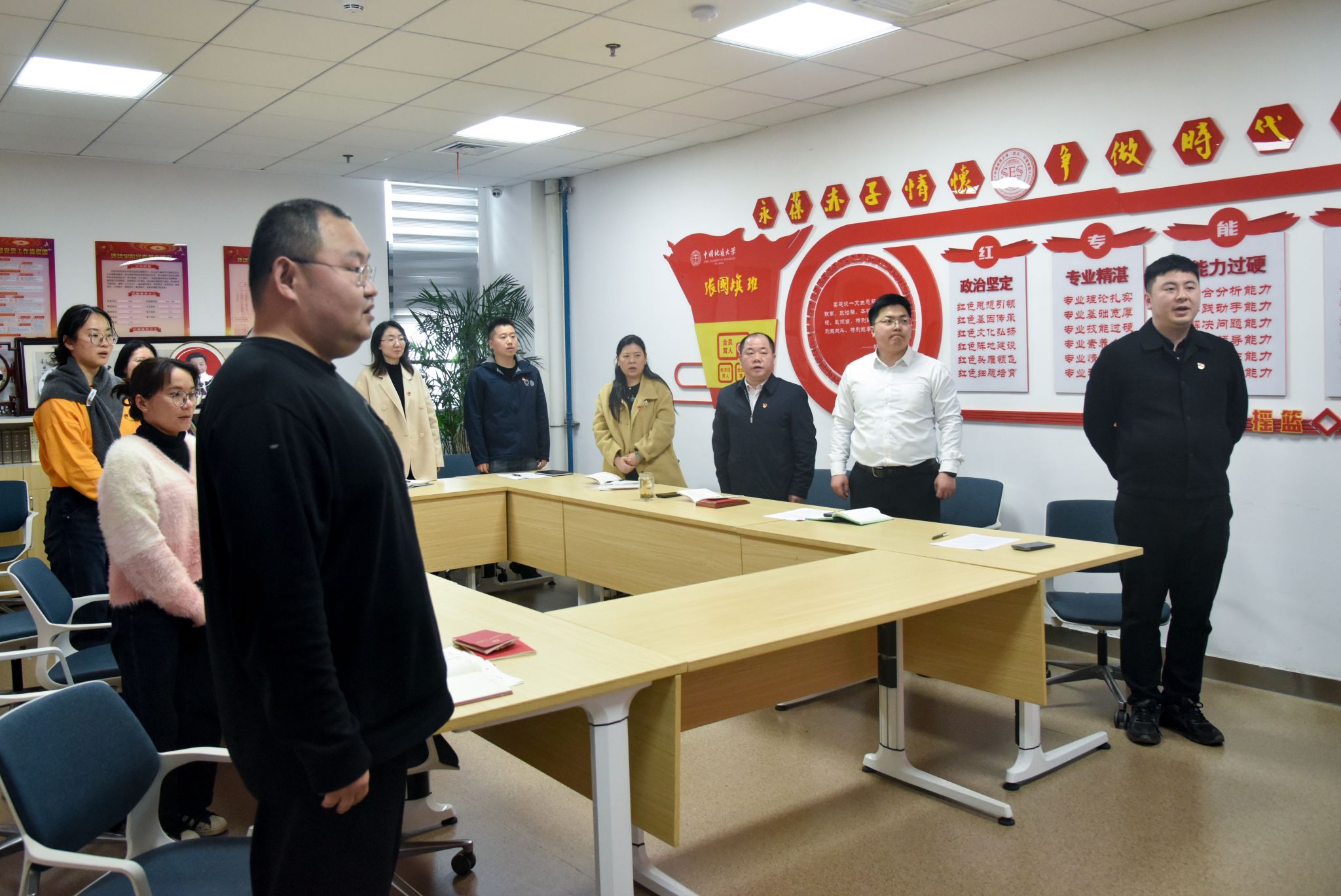 支部党员唱国歌、温誓词。
